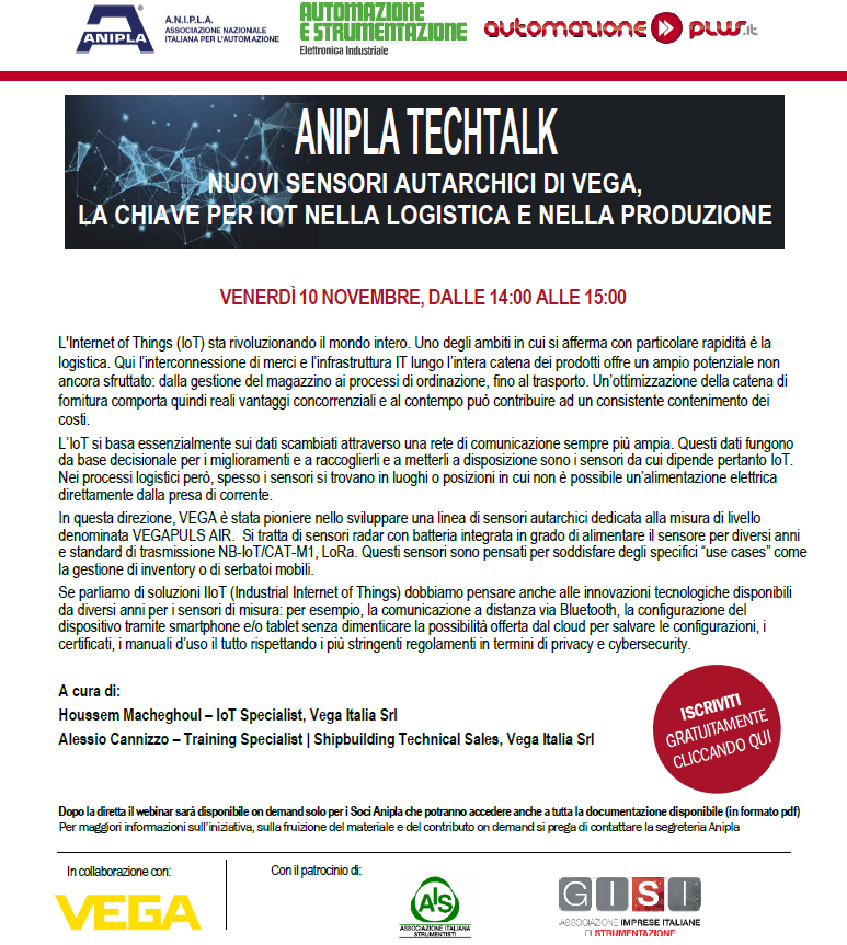 ANIPLA TECHTALK – NUOVI SENSORI AUTARCHICI DI VEGA, LA CHIAVE PER IOT NELLA LOGISTICA E NELLA PRODUZIONE